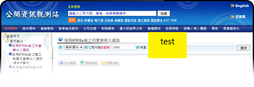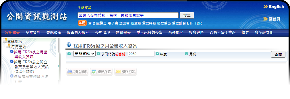 查詢歷史資料:輸入公司代號2069及年度、月份再按「查詢」,即可查詢本公司營收資訊。