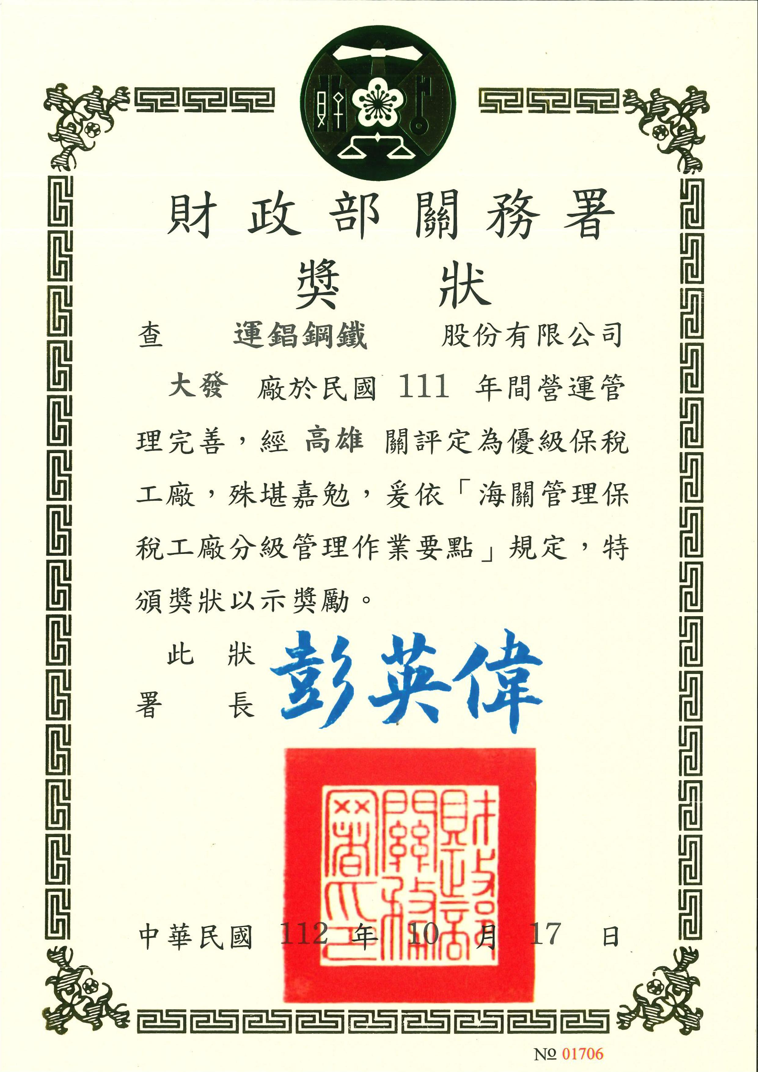 大發廠榮獲財政部關務署頒發111年優級保稅工廠 2023/10/17