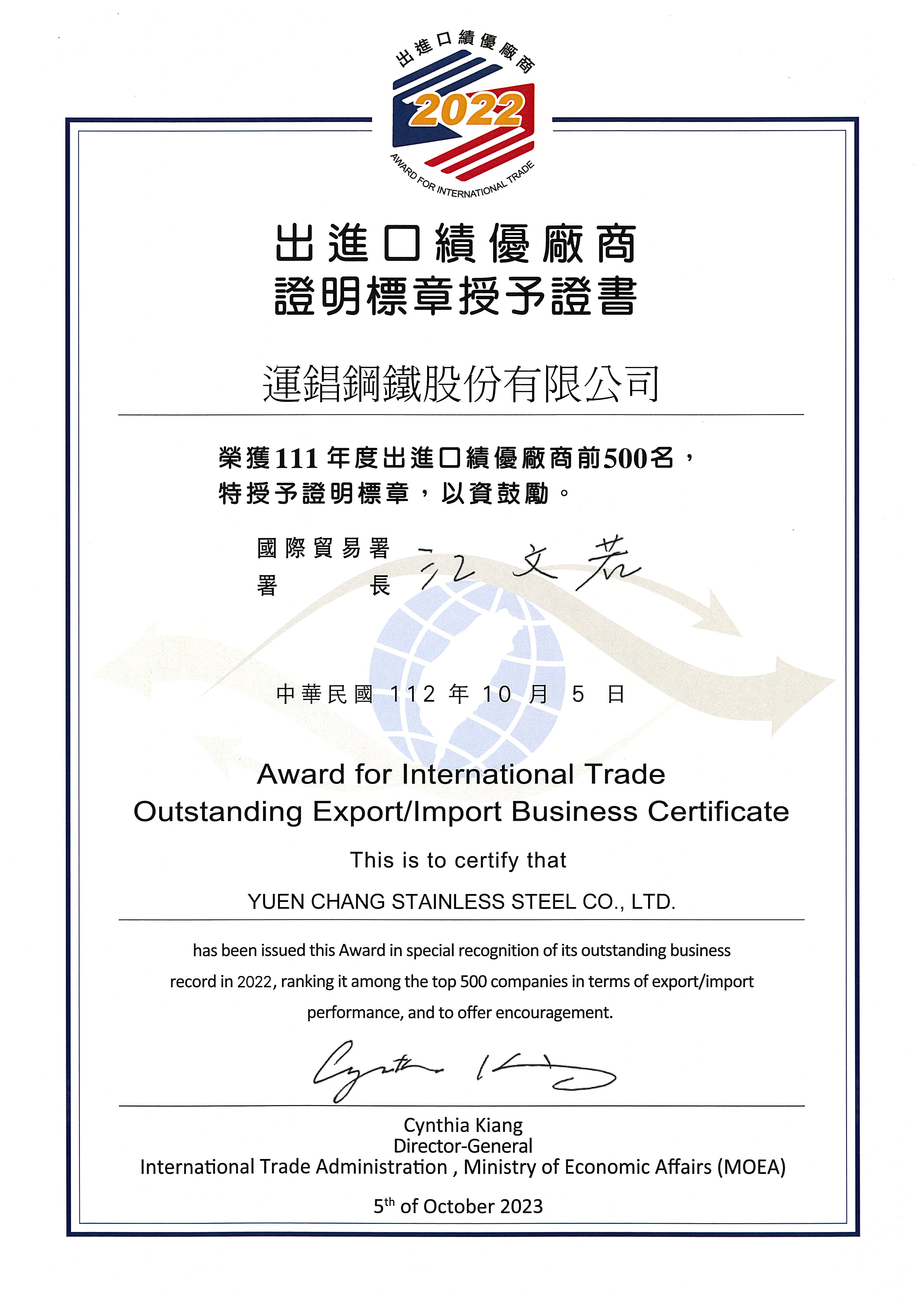 榮獲111年度出進口績優廠商前500名 2023/10/05