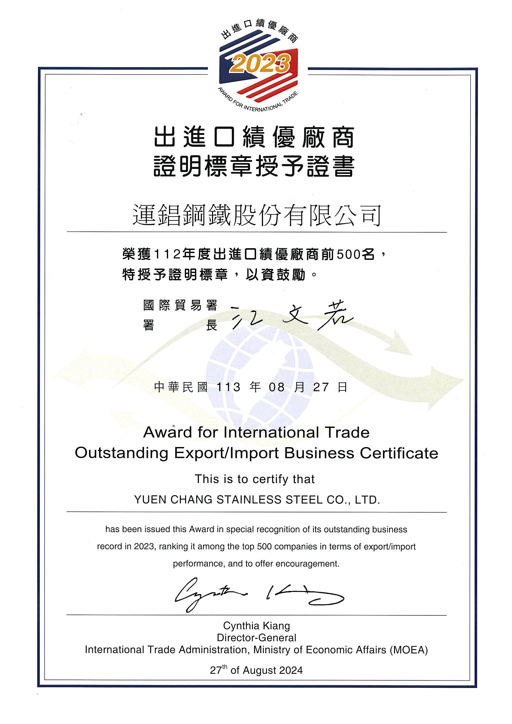 榮獲112年度出進口績優廠商前500名 2024/08/27